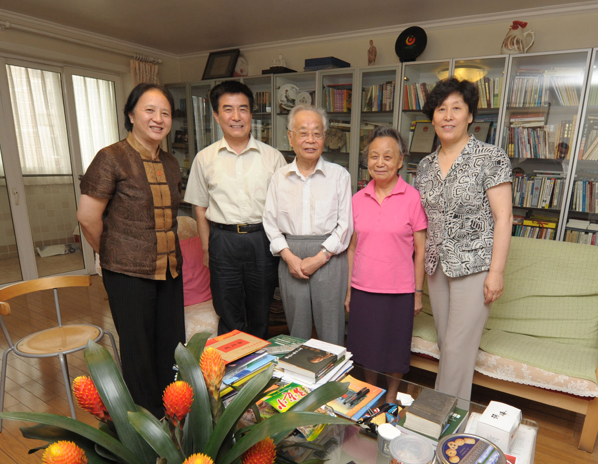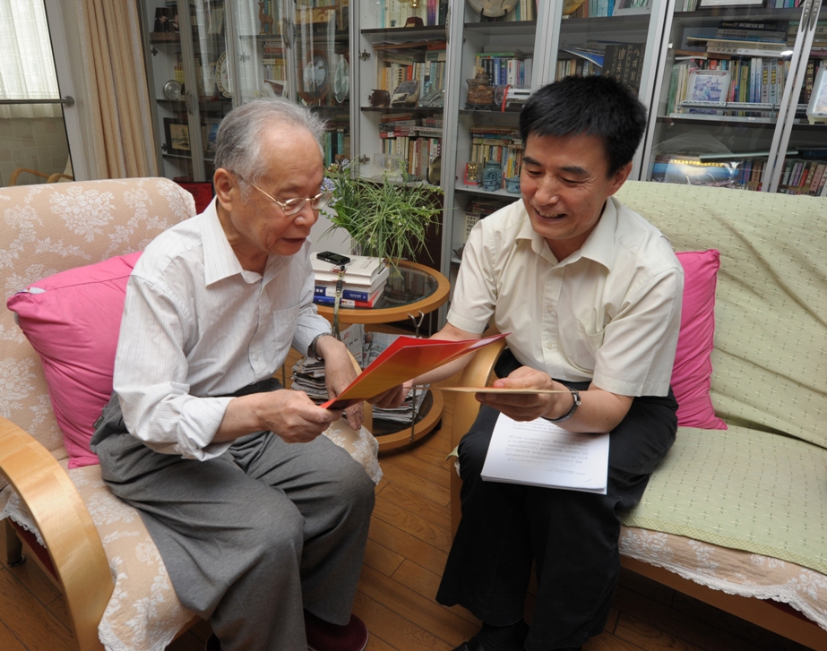 何祚庥向王副部长讲述了他最近学习和研究的体会,他还不时拿起报纸和书桌上翻看得很旧的《邓小平文选》,找到自己印象深刻的段落,念给大家听,并向领导们转达了他的个人见解。他对中组部领导在建党90周年之际看望老党员、老科学家表示感谢。
