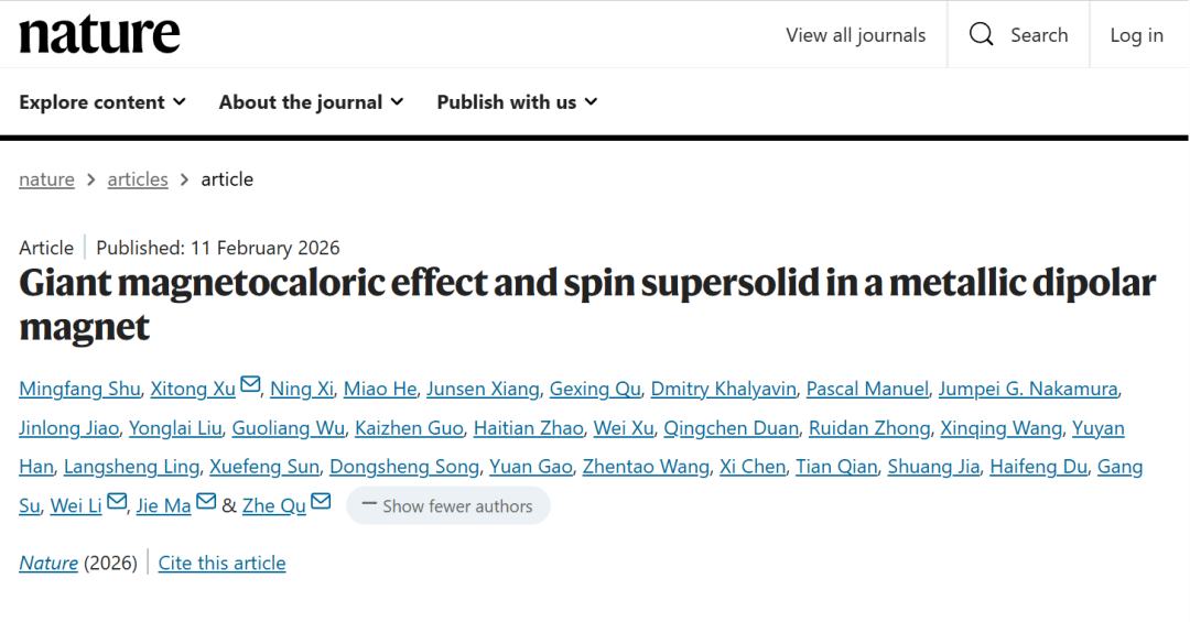 在中国科学院基础科学研究局的战略组织与推动下,来自中国科学院和高校等多个研究单位的理论和实验团队通力合作,集智攻关,依托稳态强磁场实验装置(合肥)、综合极端条件实验装置(怀柔)、上海光源以及英国散裂中子源、日本物质·生命科学实验设施等国内外大科学装置,通过基础研究源头创新驱动极低温制冷的颠覆性新技术发展。研究成果于2026年2月11日以“Giant magnetocaloric effect and spin supersolid in a metallic dipolar magnet”为标题发表在国际期刊Nature [1],并已获中国发明专利授权[7]。Nature审稿人高度评价本工作中发现的金属自旋超固态材料“同时具备适用于100毫开尔文温区的绝热去磁制冷能力与优异的电导(及热导)性能,这一特性组合是独一无二的”;“除了实际应用潜力,该材料还被提出可作为自旋超固态的候选体系,为基础物理研究与技术应用领域均带来了引人注目的启示。”