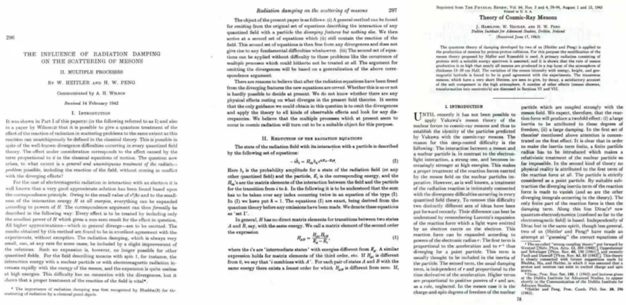 左:彭桓武与海特勒辐射阻尼理论的文章首页;右:海特勒、汉密尔顿与彭桓武HHP宇宙线理论的文章首页