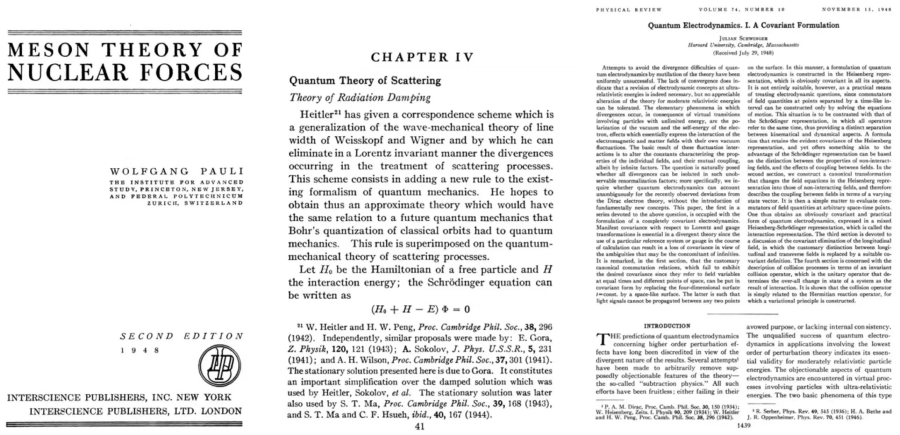 左:泡利的著作封面;中:泡利著作中辐射阻尼理论的章节;右:施温格量子电动力学经典文章的首页