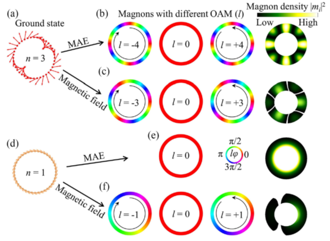 3.通过LLG动力学计算,发现了不同轨道角动量磁子模的杂化现象,证明高阶涡旋状态(n>1)在存在磁各向异性的情况下,能够提供一个由轨道角动量选择规则(∆l = ±2(n-1))控制的磁子模杂化机制,这种杂化在普通涡旋(n=1)中是不存在的。这一发现为产生与调控高轨道角动量磁子提供了新颖且实用的途径。研究表明,高阶涡旋状态下的轨道角动量杂化机制,在磁各向异性足够强时,有潜力打开磁子能带的带隙,这对构建磁子电子学器件至关重要。