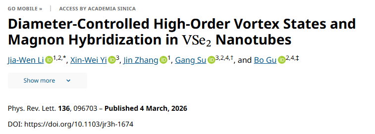 最近,中国科学院理论物理研究所苏刚研究员、中国科学院大学顾波副教授和国家纳米科学中心李嘉文博士等人的联合团队,在VSe₂单壁纳米管研究中取得了重要进展。他们采用密度泛函理论、海森堡模型建模和Landau-Lifshitz-Gilbert(LLG)方程等多重手段,系统研究了VSe₂纳米管的磁性基态,首次发现了直径调控的高阶涡旋态和磁子轨道角动量杂化现象,并提出了一种产生高轨道角动量磁子的全新机制。由于这类高轨道角动量磁子对外界干扰不敏感,因此在信息传输和储存中具有独特优势。相关研究成果近期发表在Physical Review Letters 136, 096703 (2026)。